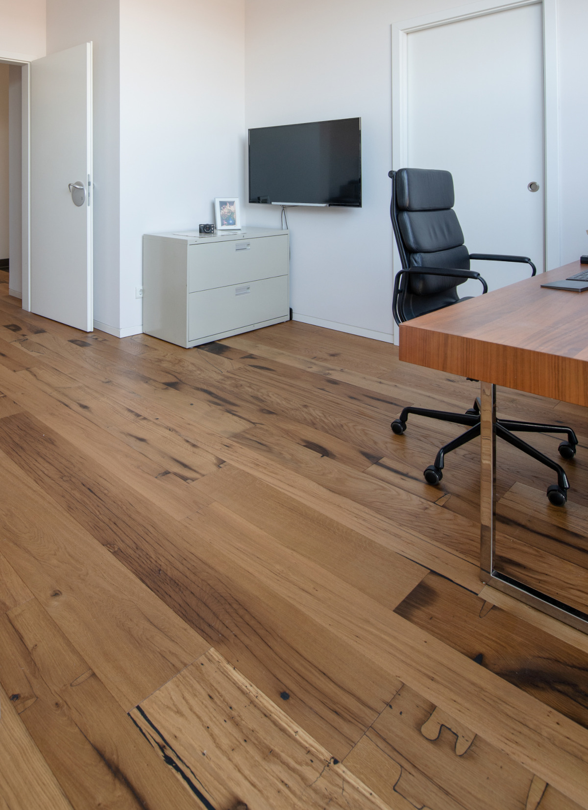 Die Holzfarben und Farbverläufe variieren bei Altholz - die Aussagekraft von Mustern aus früheren Produktionen ist begrenzt, da jede Ware eine ganz eigene Optik hat. Immer jedoch zeigt sich eine lebhafte Maserung, die den Charakter des Bodens bestimmt. Die Oberfläche wird leicht gebürstet und geölt. Durch den Einsatz eines farblosen Naturöls, wie es bei diesem Boden verwendet wurde, intensiviert sich die natürliche Farbe des Holzes. Alternativ ist auch eine Beschichtung mit Hartwachsöl möglich, die das Holz weniger anfeuert. Risse, Löcher und Beschädigungen sind für Parkett aus Altholz typisch; sie werden dunkel gespachtelt und tragen zur individuellen Anmutung des Bodens bei.