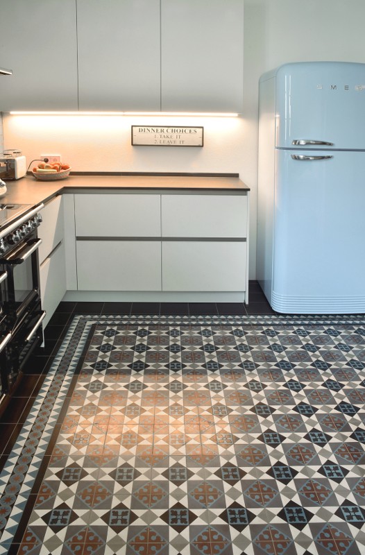 "Ganz verliebt sind wir auch in unsere VIA Zementfliesen im Küchenbereich. Auch auf die Fliesen sind wir in der Musterausstellung von S. Fischbacher Living gestoßen. Die Kombination der natürlichen Zementoberfläche mit unserem Massivholzboden hat uns sofort überzeugt, und wir konnten Farbe und Muster genau auf unser Parkett abstimmen“.
