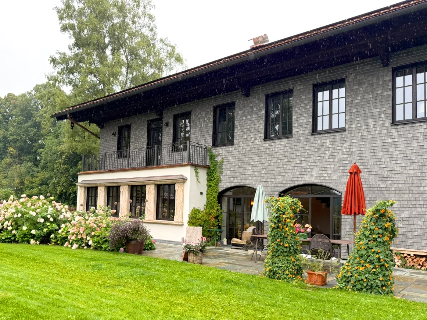 Das Anwesen überzeugte die neue Eigentümerin durch seine wunderschöne Lage am Rand der oberbayerischen Berge. In dem 60 Jahre alten Gebäude sah sie Potenzial: Ihr gefielen der klassische Stil und die hohen Räume. Alles andere wurde jedoch im Zuge einer grundlegenden Sanierung neu gestaltet. Zwischenwände mussten weichen, es entstanden zusätzliche Fenster und - für die Bauherrin ein wichtiger Faktor - große Terrassentüren, die das Haus zum wunderschönen Garten hin öffnen. Von außen vermittelt die neue Fassade aus grauen Holzschindeln einen traditionellen, natürlichen und zugleich edlen Eindruck.