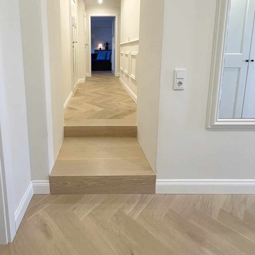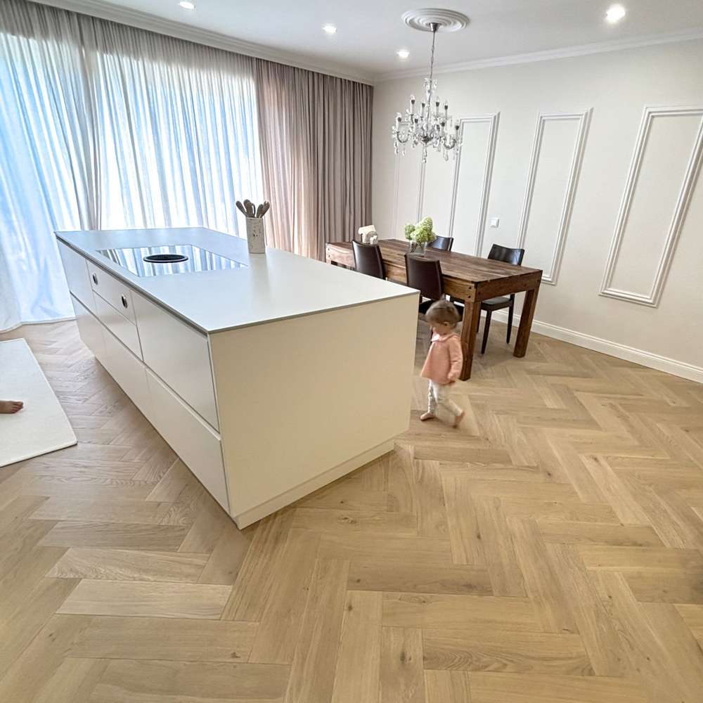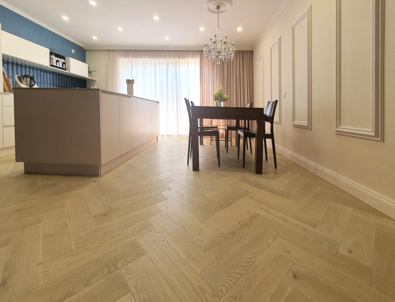 Klassisches Fischgrätparkett, Eiche Clear White, Oberfläche Hartwachsöl, gebürstet, Sortierung Select / Living,