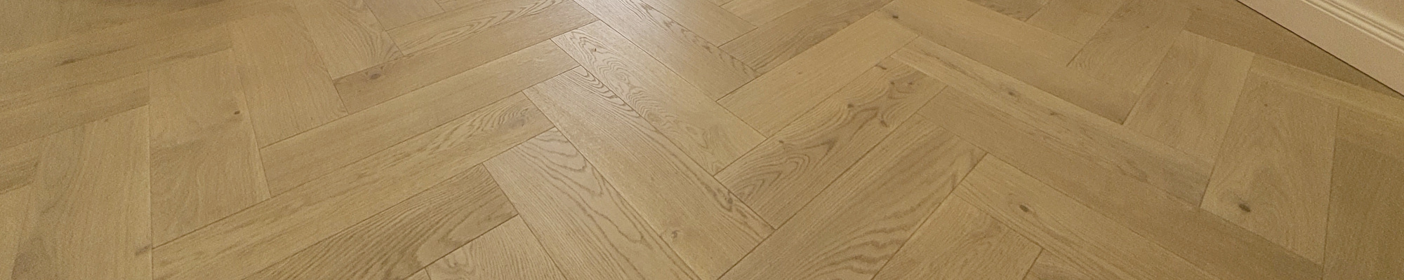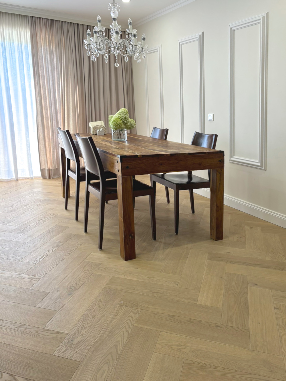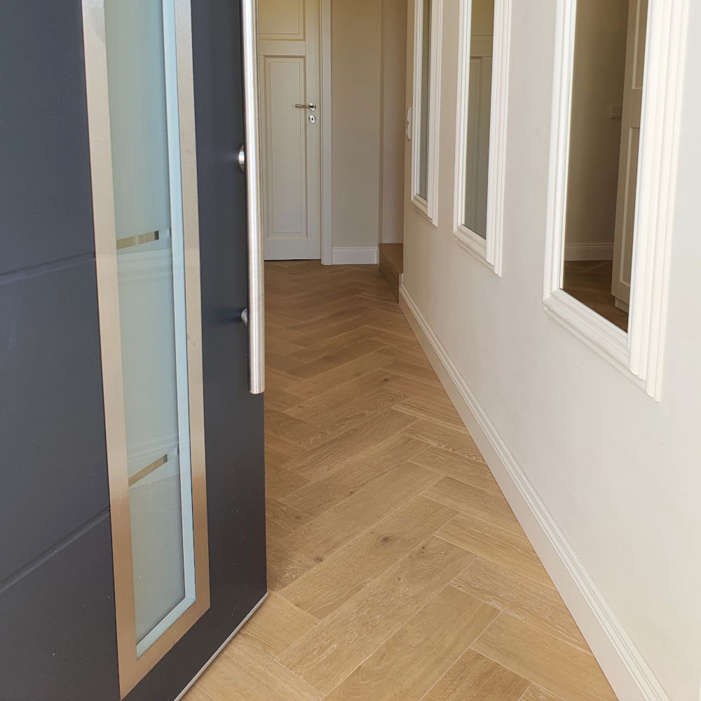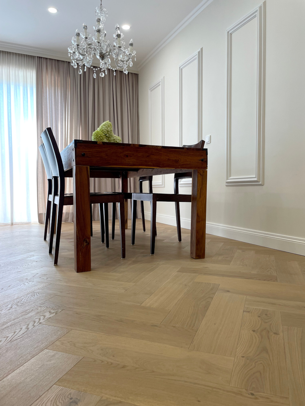 Klassisches Fischgrätparkett, Eiche Clear White, Oberfläche Hartwachsöl, gebürstet, Sortierung Select / Living,
