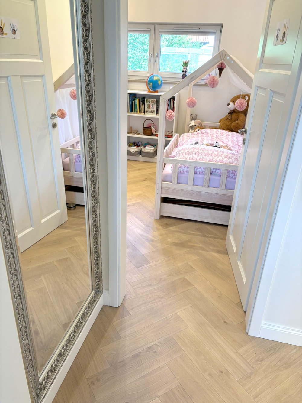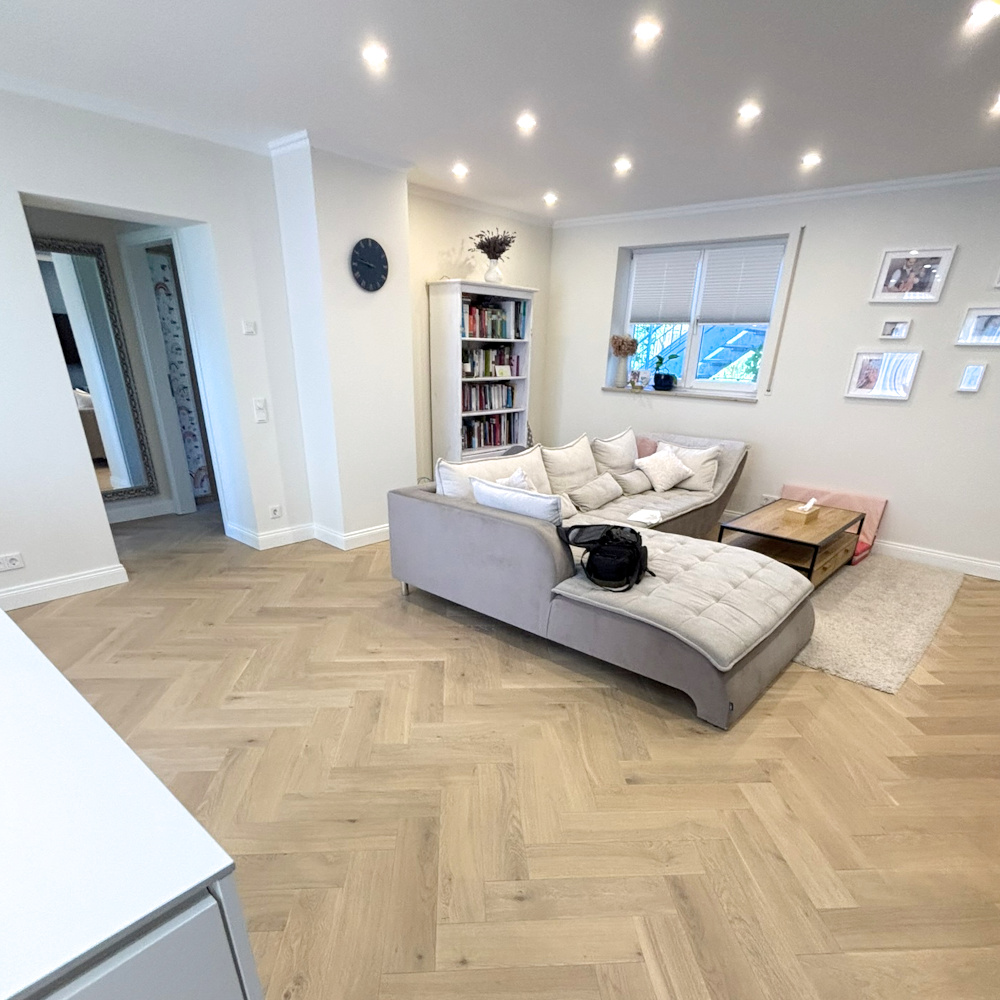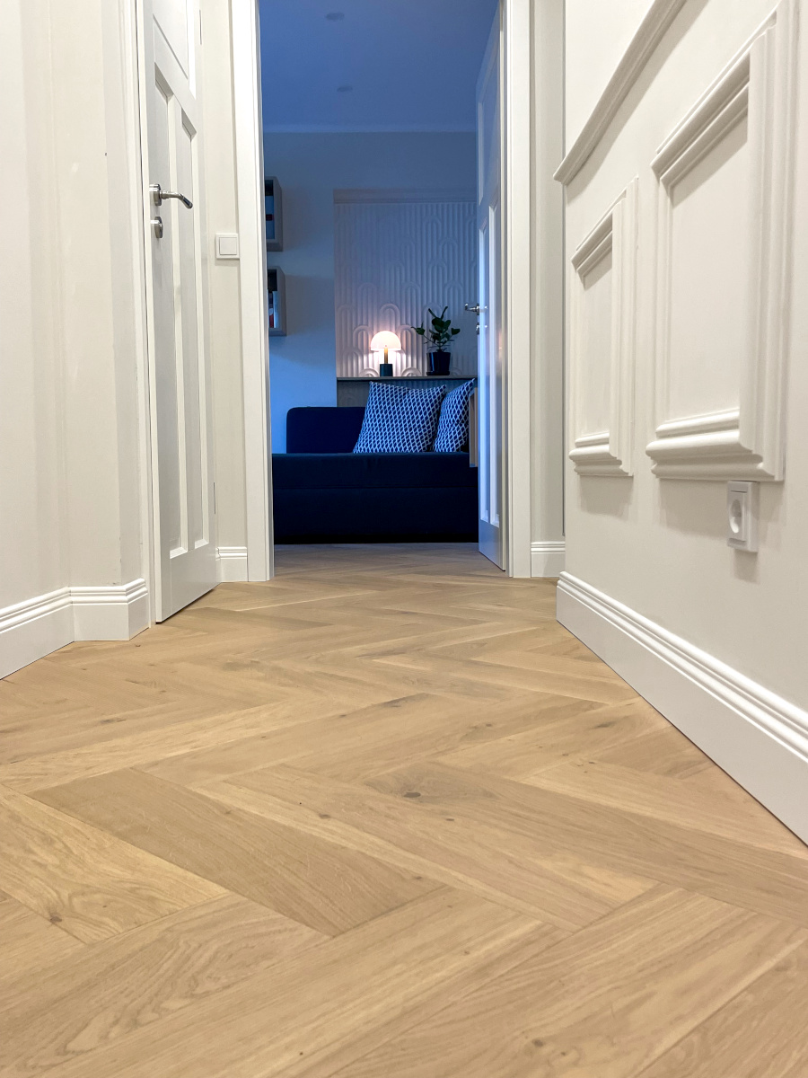 Eindrücke vom hellen, klassischen Fischgrätparkett in der sanierten Wohnung
