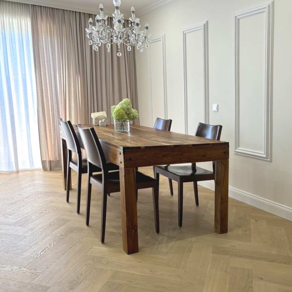 Zeitlose Eleganz trifft auf Natürlichkeit: In der Wohnung einer jungen Familie bestimmen sorgfältig ausgewählte Materialien das einladende Ambiente. Das helle Fischgrätparkett schafft mit seiner natürlichen Oberfläche eine angenehme Raumatmosphäre. Dazu wurden dekorative ORAC Stuckelemente an Wänden und Decke kombiniert, die den Räumen klassische Eleganz verleihen. Im Spielparadies der beiden Töchter hingegen schaffen helle Eichendielen eine ruhige, natürliche Grundstimmung.