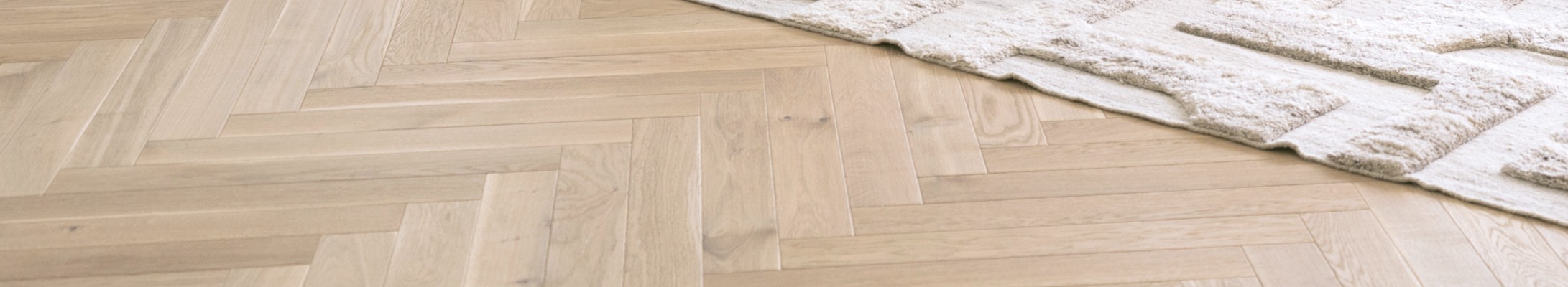 Die Fischgrätstäbe aus massiver Eiche sind mit pigmentiertem Hartwachsöl behandelt, welches dem Holz seinen hellen, zarten Farbton verleiht. Zugleich wird das Parkett durch diese Behandlung sehr robust und pflegeleicht.