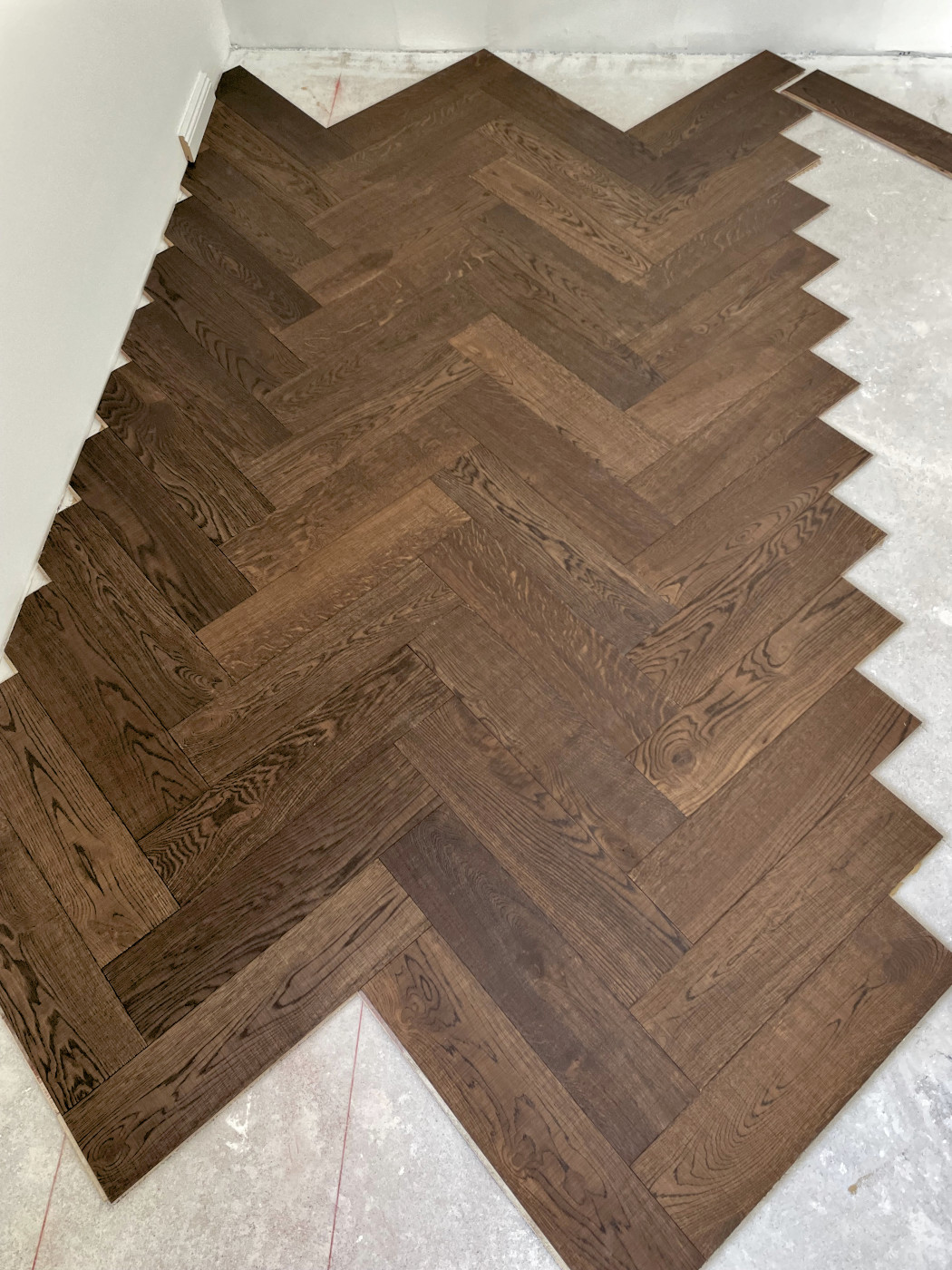Klassisches Fischgrätparkett, Eiche Chestnut - Naturöl mit sägerauer Oberfläche,