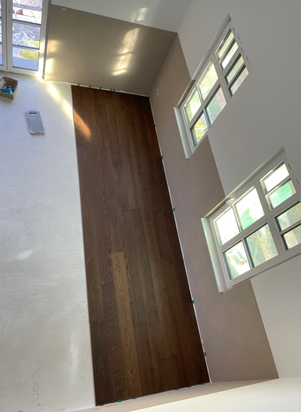Dunkler, sägerauer Holzboden als Bodenbelag für die historische Villa